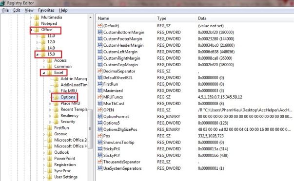 Bước 2: Trong Registry Editor bạn chọn HKEY_CURRENT_USER \ Software \ Microsoft \ Office \ 15.0 \ Excel \ Options